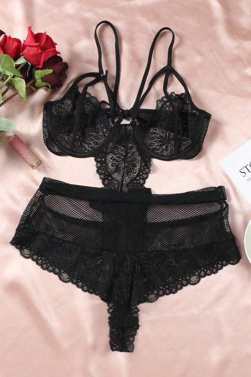 Black Plus Fishnet Lace Hollow-out Teddy Lingerie