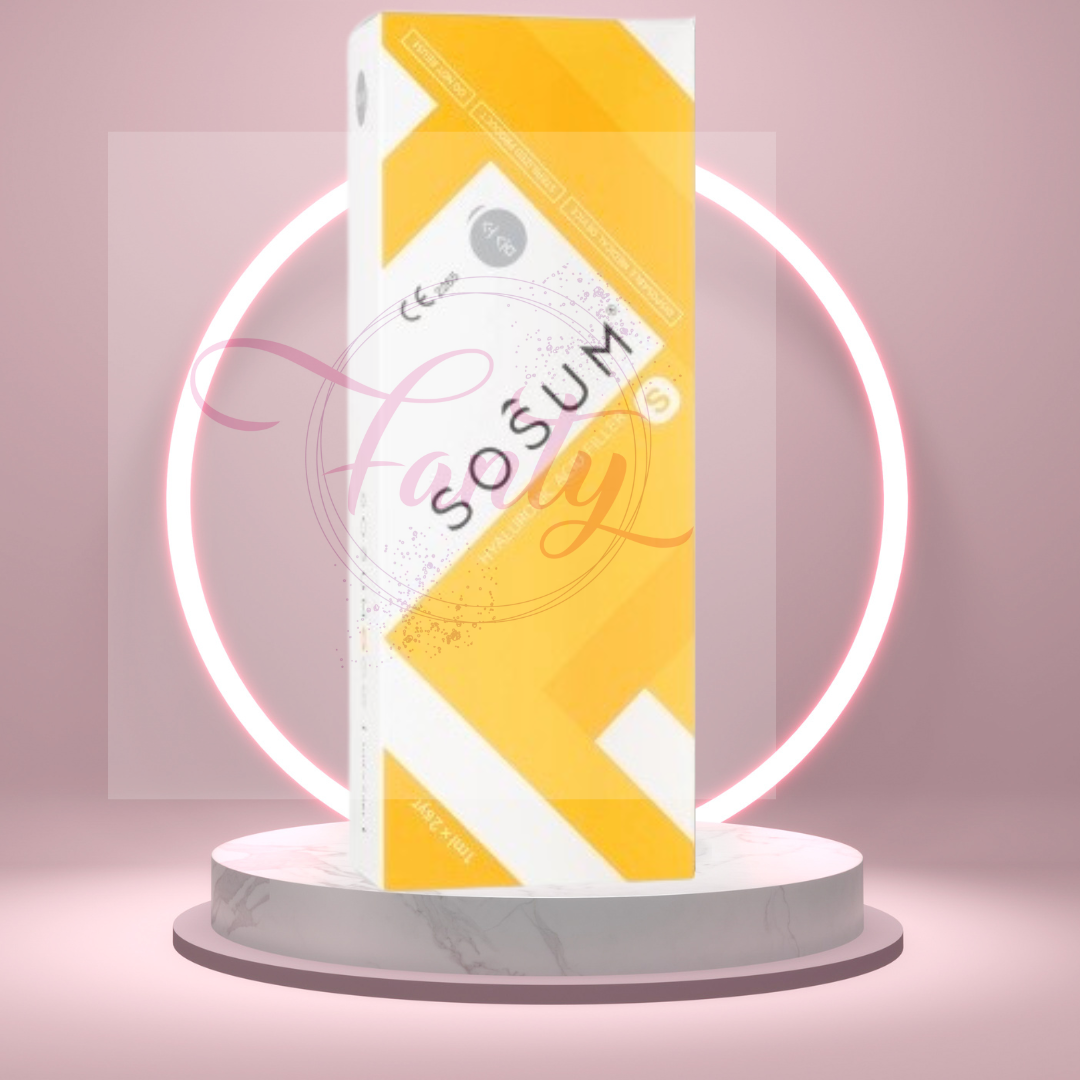 Sosum S is a stabilized hyaluronic acid- (HA)-based filler with high cross-linking rate. Sosum fillers have outstanding density, viscosity, and elasticity. The reaction of HA cross-linking is held under low temperatures, which allows obtaining dense and finely packed HA gel structure. Two-step purification of HA after the cross-linking reaction minimizes the level of residual BDDE. High cross-linking rate ensures longer effect duration due to enhanced resistance of HA to degradation. Zero residual BDDE and low endotoxin levels minimize allergic reactions and other side effects after the procedure. Low injection force of the HA gel guarantees uniform and painless distribution of the filler during injection.